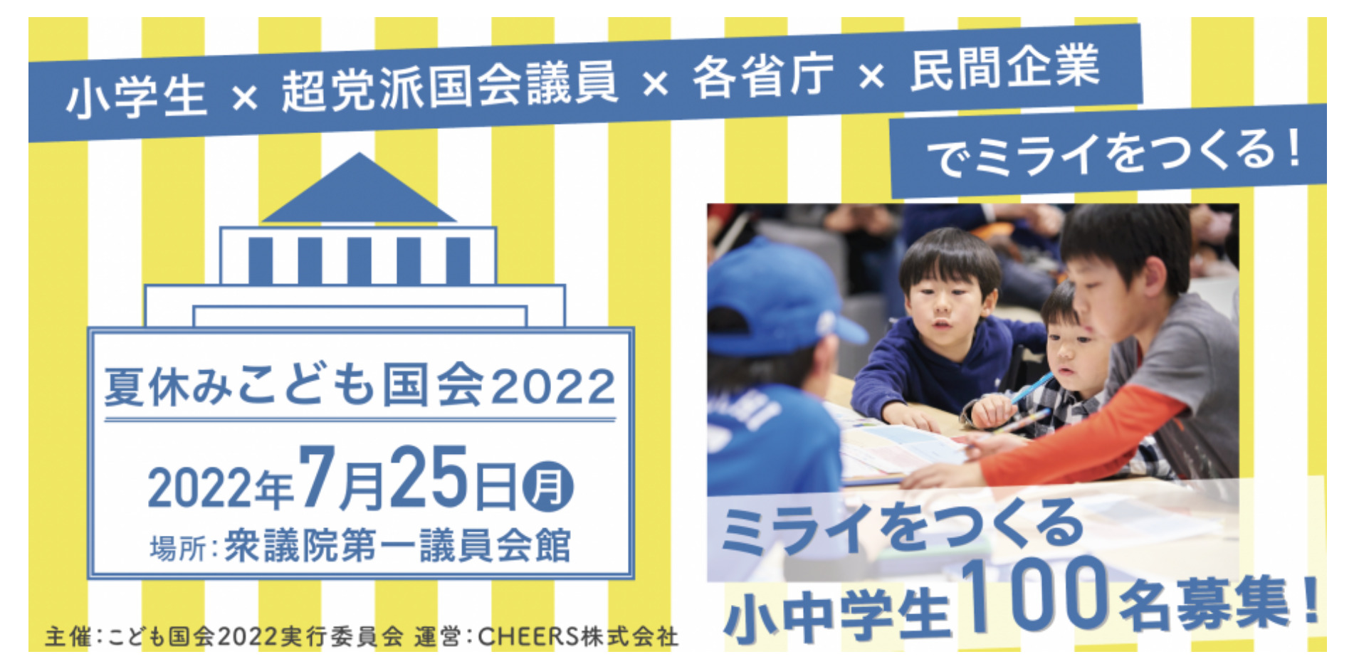 さまざまな職業にこどもが出会えるイベント「ワクワクワークプロジェクト」の一つである「夏休みこども国会2022」。100名の子どもたちを国会議事堂に招待し、国会議事堂の中を見学したり、国会議員にインタビューしたりするイベントです。子どもたちにとっては貴重な機会になりそうです。