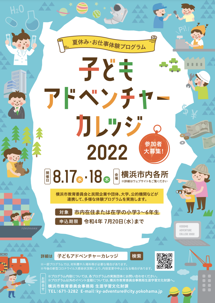 子どもアドベンチャーカレッジ2022は、横浜市で開催されるお仕事体験イベントです。消防士の体験や、横浜信用金庫による「キッズ・マネースクール」、公益社団法人横浜貿易協会の「夏休み子ども貿易教室」など、さまざまな講座が用意されています。
