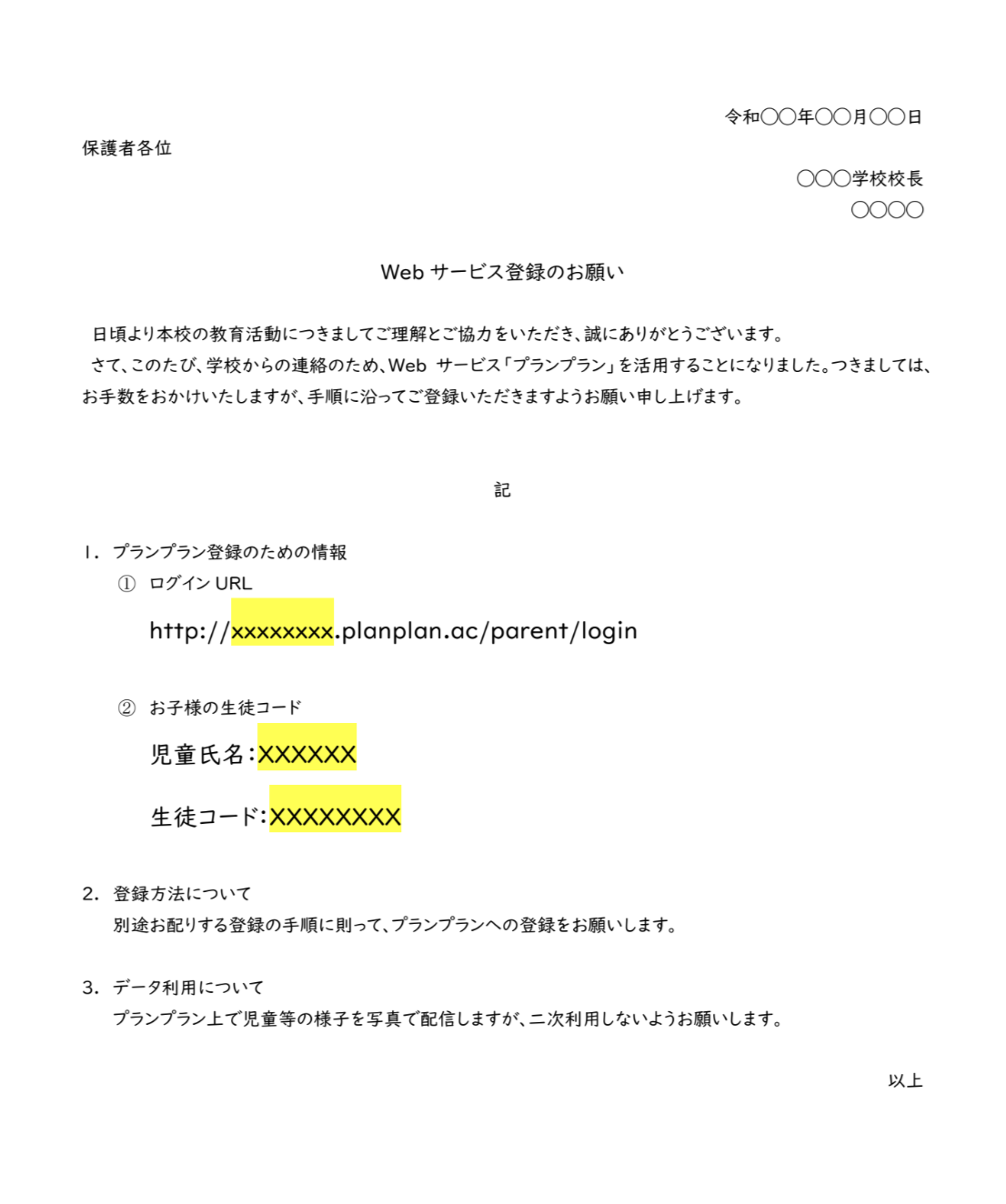 プランプランを学校で導入する際、保護者の方へ学校から配るお知らせのテンプレートを作成しました。
