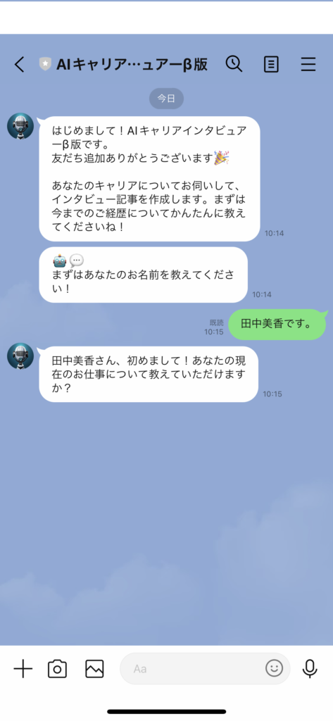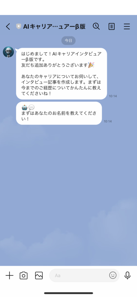 インタビュアーとの会話を通じ、ご自身の今までの経歴や印象的な出来事について改めて見直す機会になります。また、最終的にはAIキャリアインタビュアーが「インタビュー記事」を作成します。ぜひ気軽に試してみてください!