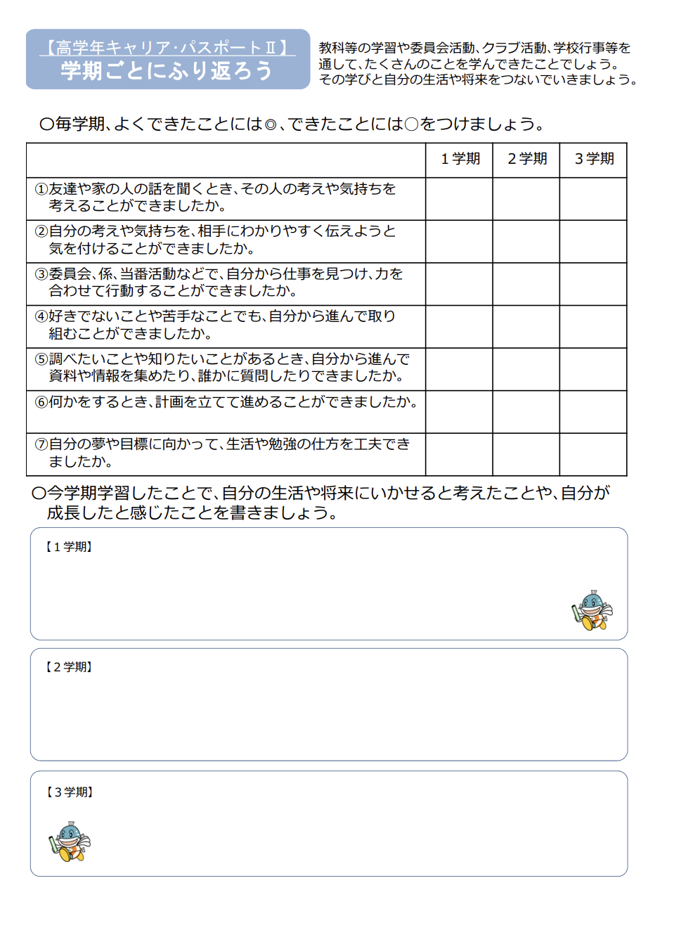 「共通シート」は、小学校、中学校、高校のそれぞれに作成されています。基本的に1学年2枚になっており、1枚は、学年の初めと終わりに記入するもの、もう1枚は毎学期の振り返りを記入するものです。