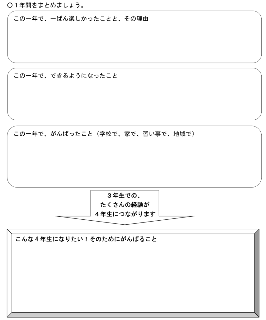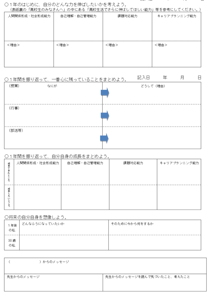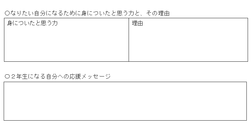 1年の振り返りについても次の学年になる自分へのメッセージの項目1~3年まで同様の構成となっています。