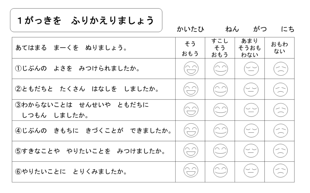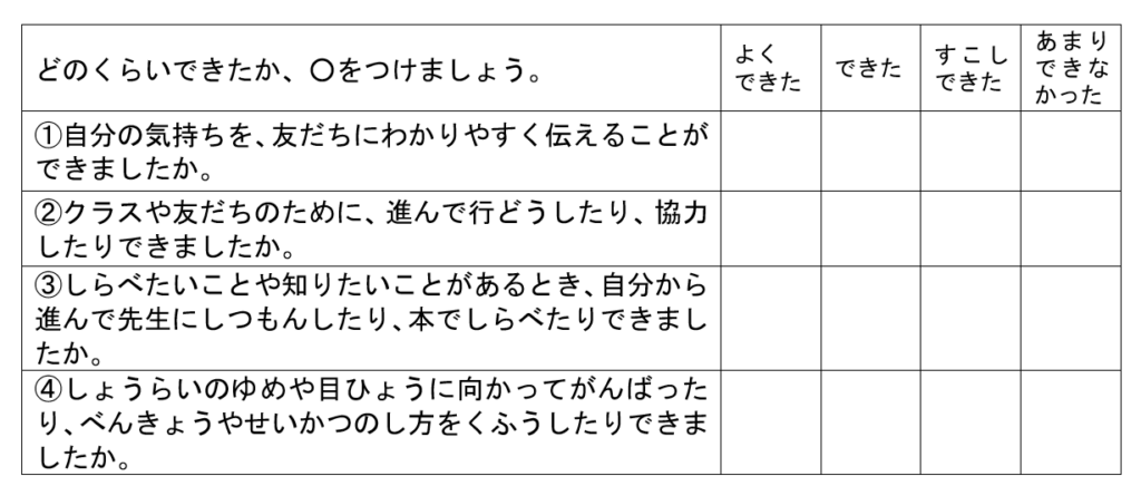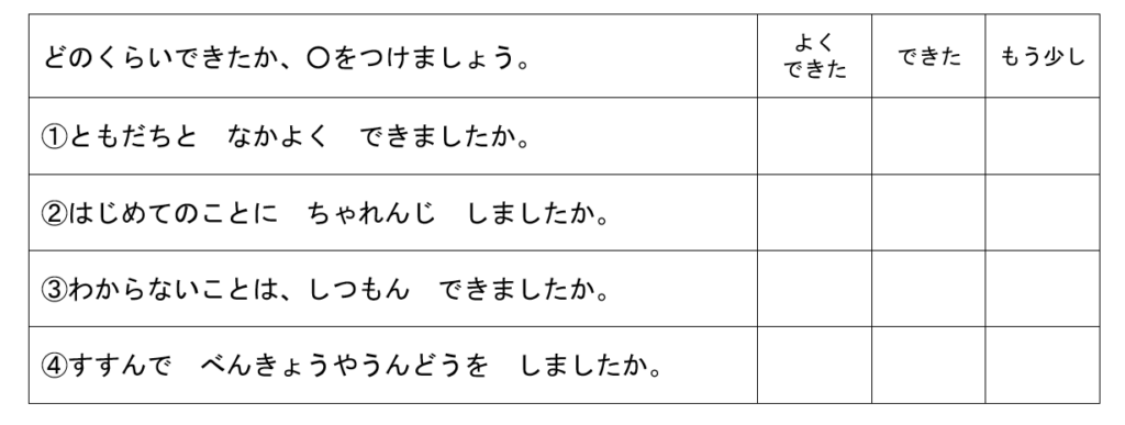 各項目について、どのくらいできたかということを振り返り〇をつける方式になっています。