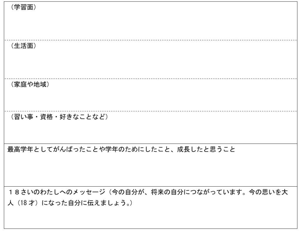 6年生の振り返りについてはさらに、「最高学年としてがんばったことや学年のためにしたこと、成長したと思うこと」という項目が追加されており、最高学年としての振り返りができるようになっていたり、「18さいのわたしへのメッセージ(今の自分が、将来の自分につながっています。今の思いを大人(18才)になった自分に伝えましょう。)」という、将来について考えさせるような項目も追加されています。