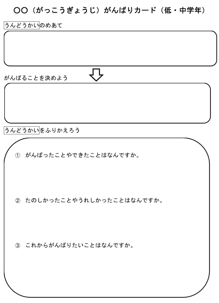 各学期、1年ごとの目標設定や振り返りの他にも、文部科学省からは「がんばりカード」というものが提示されています。