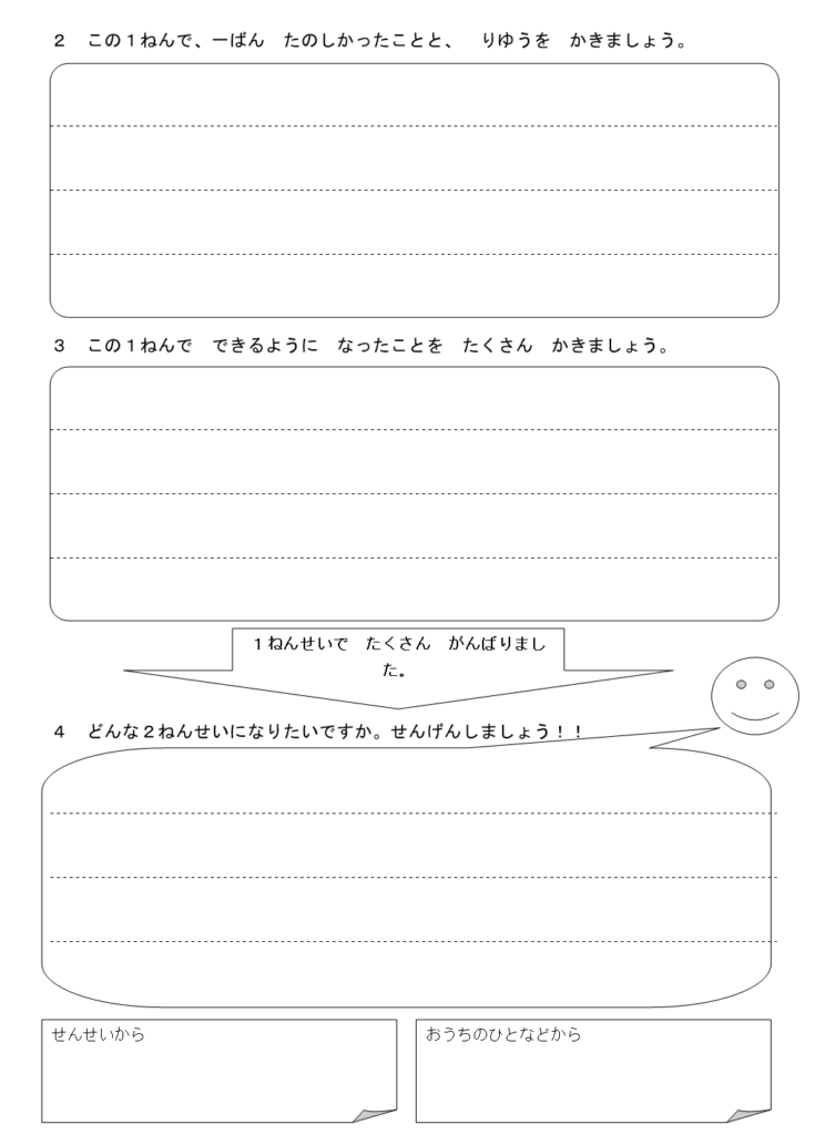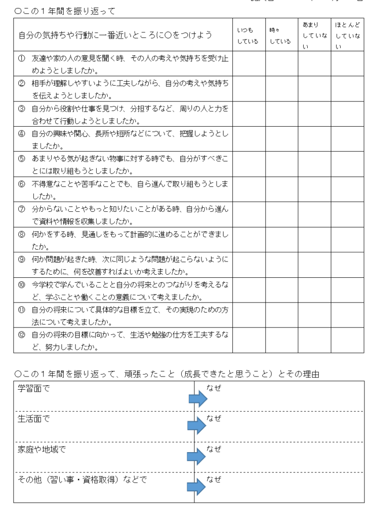 1年間の振り返りについては、「学習」「生活」「家」についての振り返りの項目と自己評価の項目、そして最後に先生からと保護者からのコメントまでは同様の構成になっています。