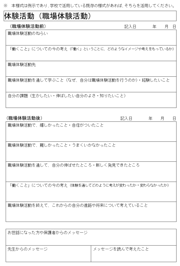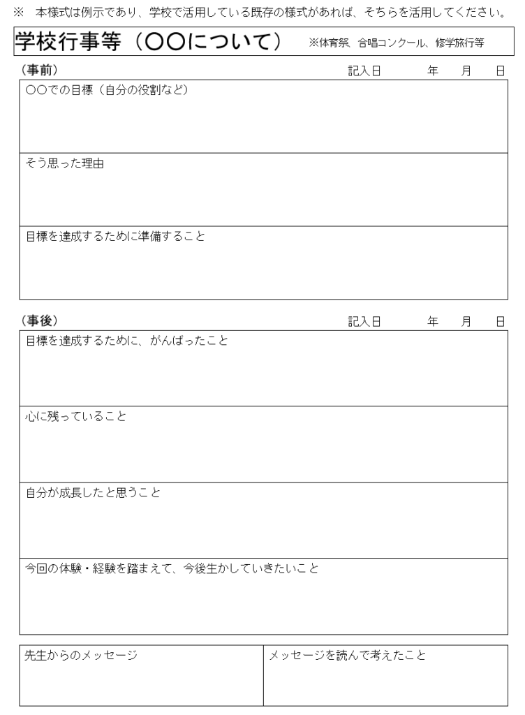 小学校のキャリア・パスポートでは「がんばりカード」という名称で提示されていましたが、中学校のキャリア・パスポートでも、職場体験活動や、学校行事について目標を立てたり、振り返りをしたりする様式が提示されています。