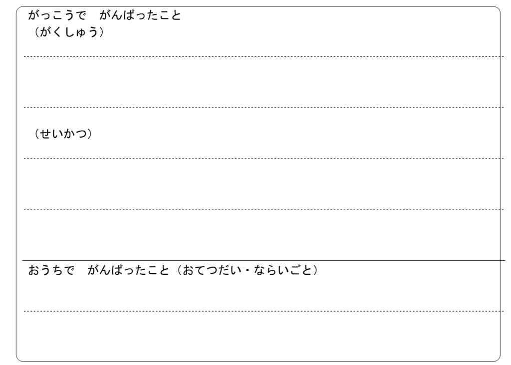 まずは「がっこうでがんばったこと」と「おうちでがんばったこと(おてつだい・ならいごと」。こちらの「がっこうでがんばったこと」ついては「がくしゅう」と「せいかつ」にわかれており、本人に記述をさせる方式になっています。また「おうちでがんばったこと(おてつだい・ならいごと」についても「がっこうでがんばったこと」と同様、記述式になっています。