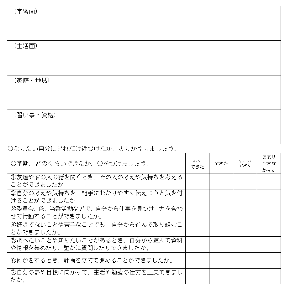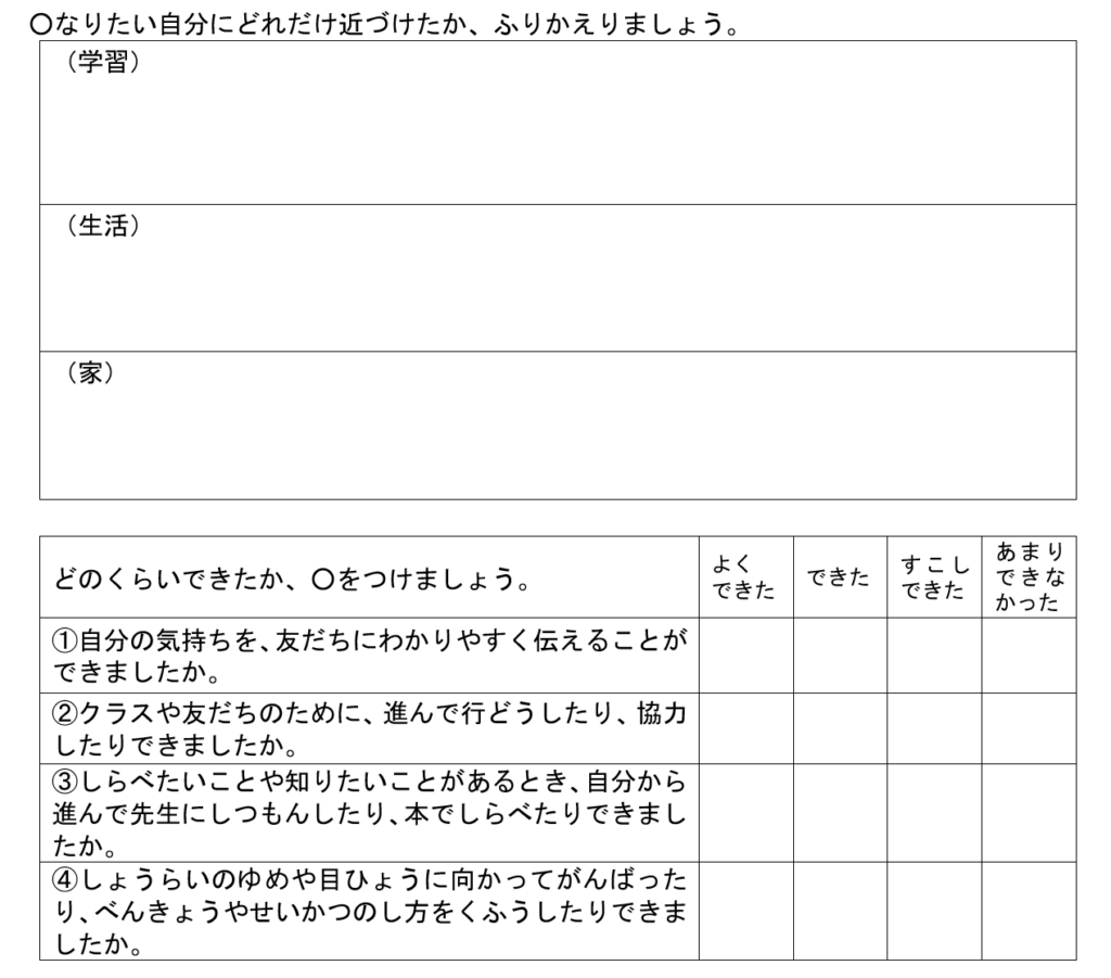 各学期の振り返りでは、まず「学習」「生活」「家」について記述式で、自分の立てた目標について振り返るようになっています。