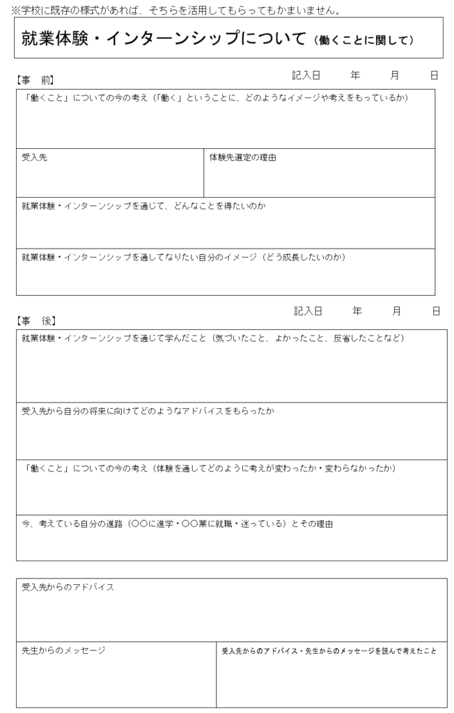 就職をするタイミングでもあることから学校行事とは別に「就業体験・インターンシップについて(働くことに関して)」が用意されているのが、小中学校のキャリア・パスポートとは異なる点かと思います。