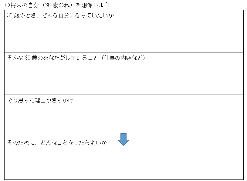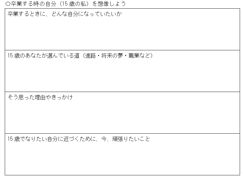 この後の構成がそれぞれの学年で異なっており、1年生は「卒業する時の自分を想像してみよう」という質問項目になっており、2年生は「将来の自分(30歳のわたし)を想像しよう」、3年生は「18歳の私へ ~小学校1年から中学校3年までの9年間~」となっています。