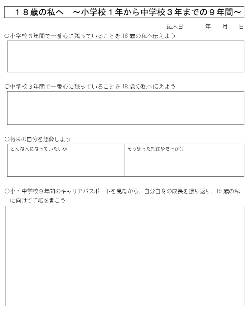 3年生では小学校から中学校3年正までの9年間を振り返り、心に残っていることをまとめたり、これまでのキャリア・キャリアパスポートを見返しながら18歳の自分へ向けて手紙を書いてみるという構成になっています。
