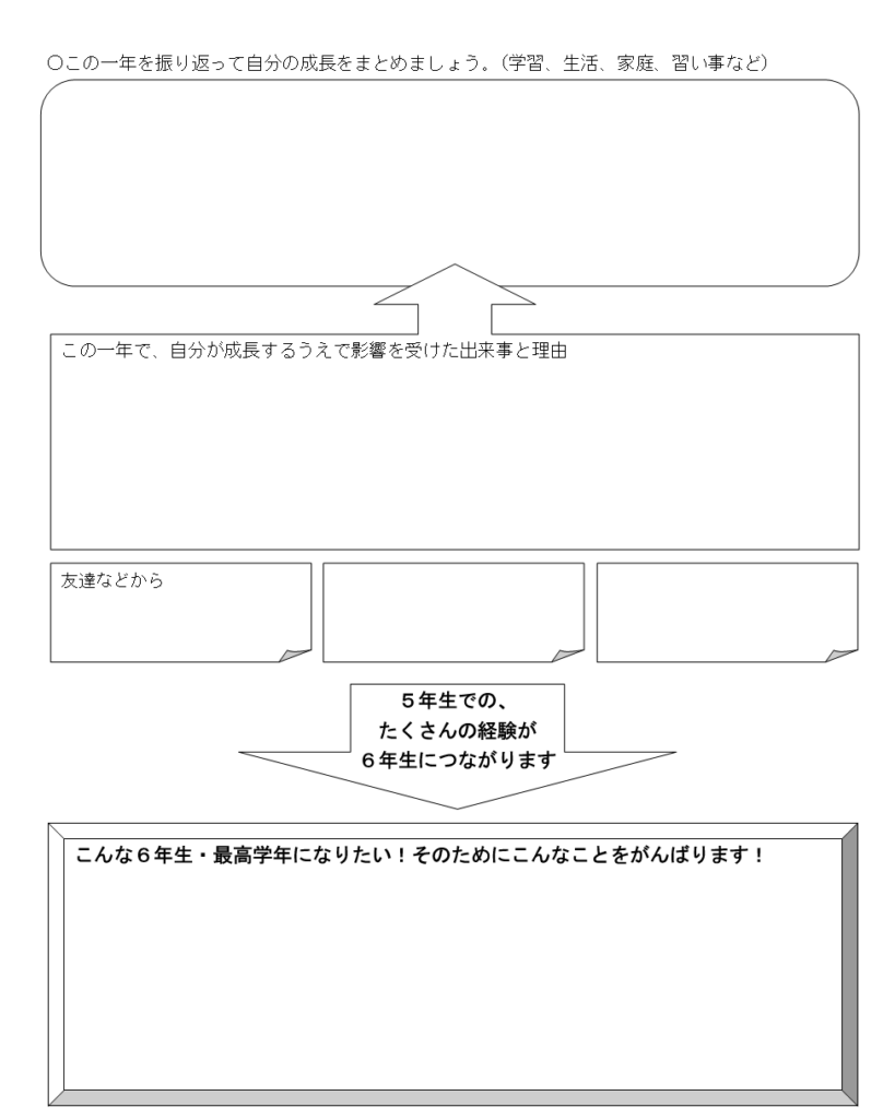 1年の振り返りについても、各学期の振り返りとほとんど同様の項目ですが、この一年を振り返って自分の成長をまとめや成長をするうえで影響を受けた出来事と理由をまとめることができるようになっていたり1~4年生のキャリア・パスポートでは無かった「友達などから」メッセージをもらう欄が追加されています。