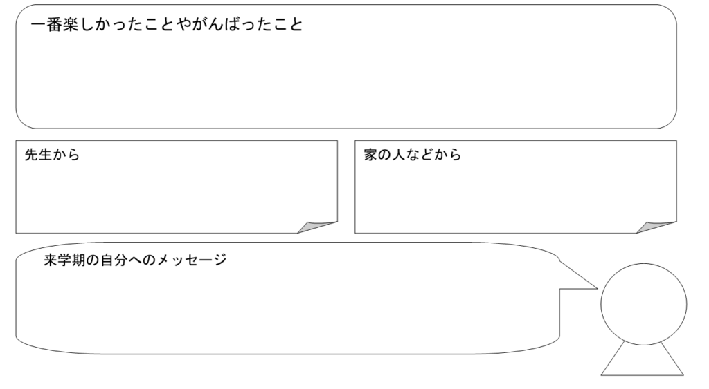 そして、「一番楽しかったことやがんばったこと」を記述式で、振り返る項目があり、最後に先生からと保護者からのコメント、そして来学期への自分へのメッセージを記述する構成になっています。