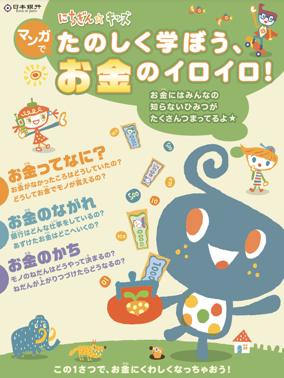 日本銀行が公開している「にちぎんキッズ」は、マンガを通して金融を学ぶことができます。小学校高学年を対象に作成されています。