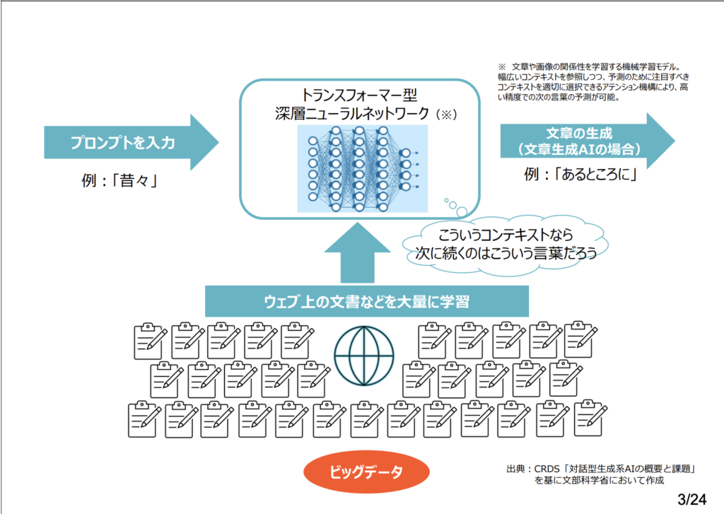 - 生成系AIとは、心臓学習によって構築した大規模言語モデル(LLM)に基づき、ある単語や文章の次に来る単語や文章を推測し、「統計的にそれらしい応答」を生成するものである。