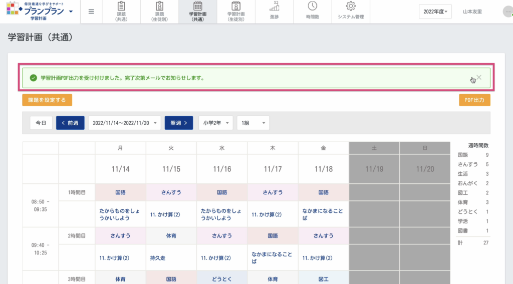 プランプラン学習計画は、先生が作成した時間割を児童生徒や保護者と共有したり、学習する課題を児童生徒が自由に当てはめたりすることができるサービスです。この学習計画を、1週間ごとにPDF出力をする機能をご紹介します。