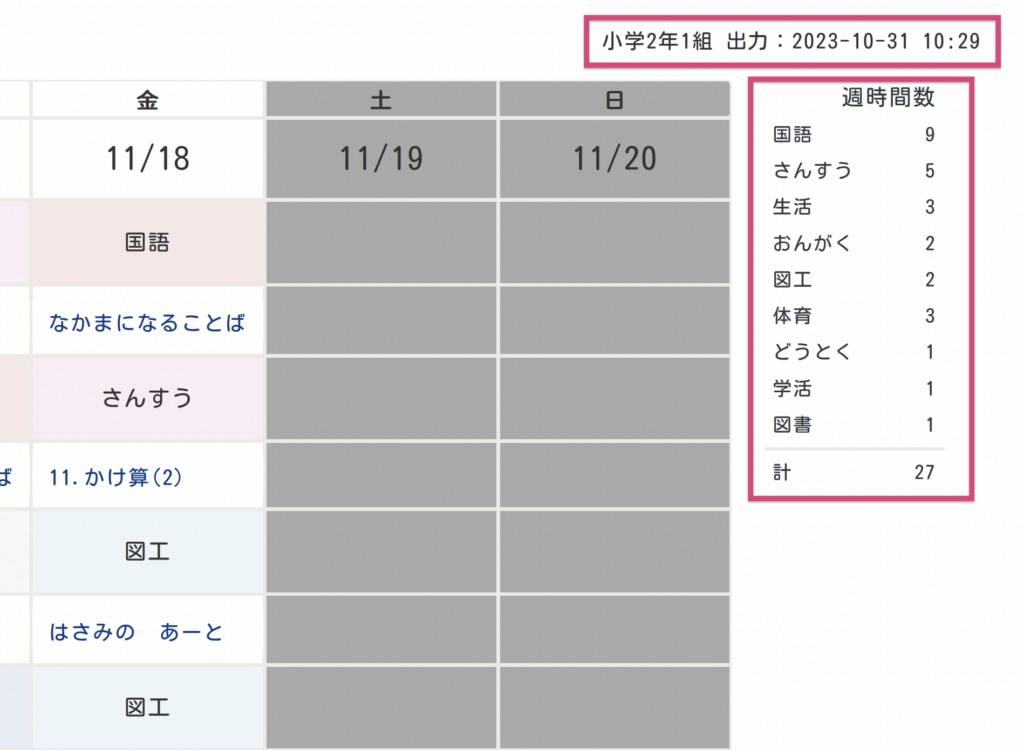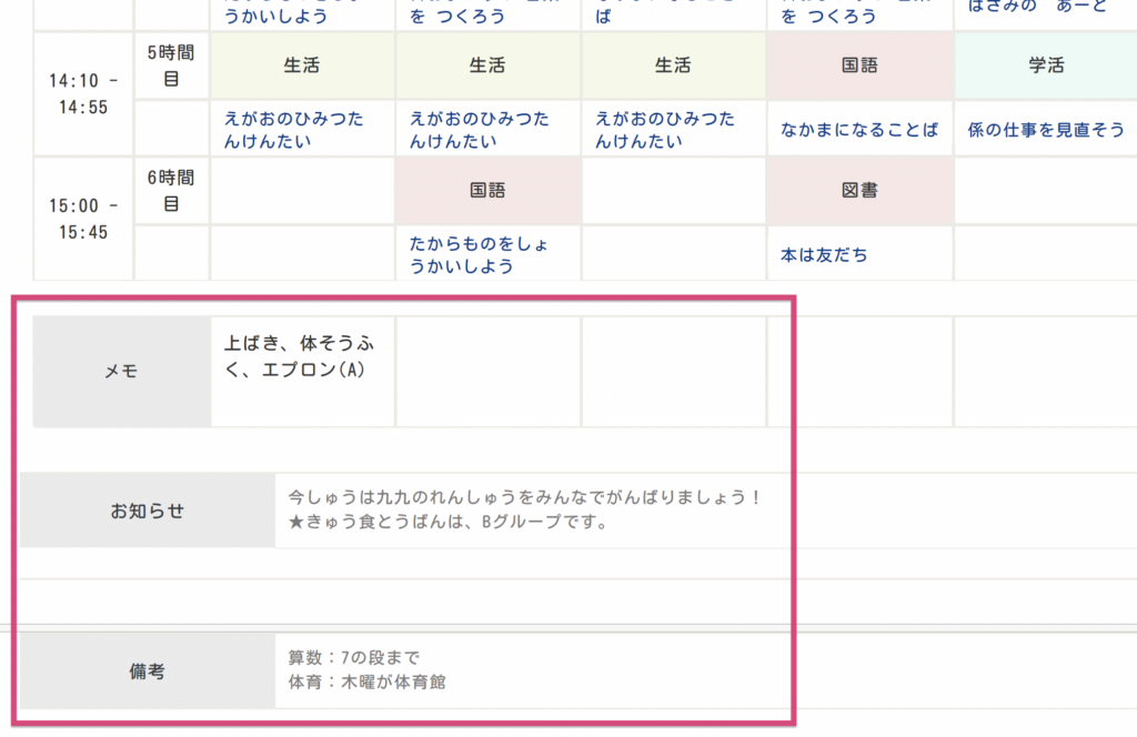 また、週の時間数、メモ、お知らせ、備考欄も含まれます。