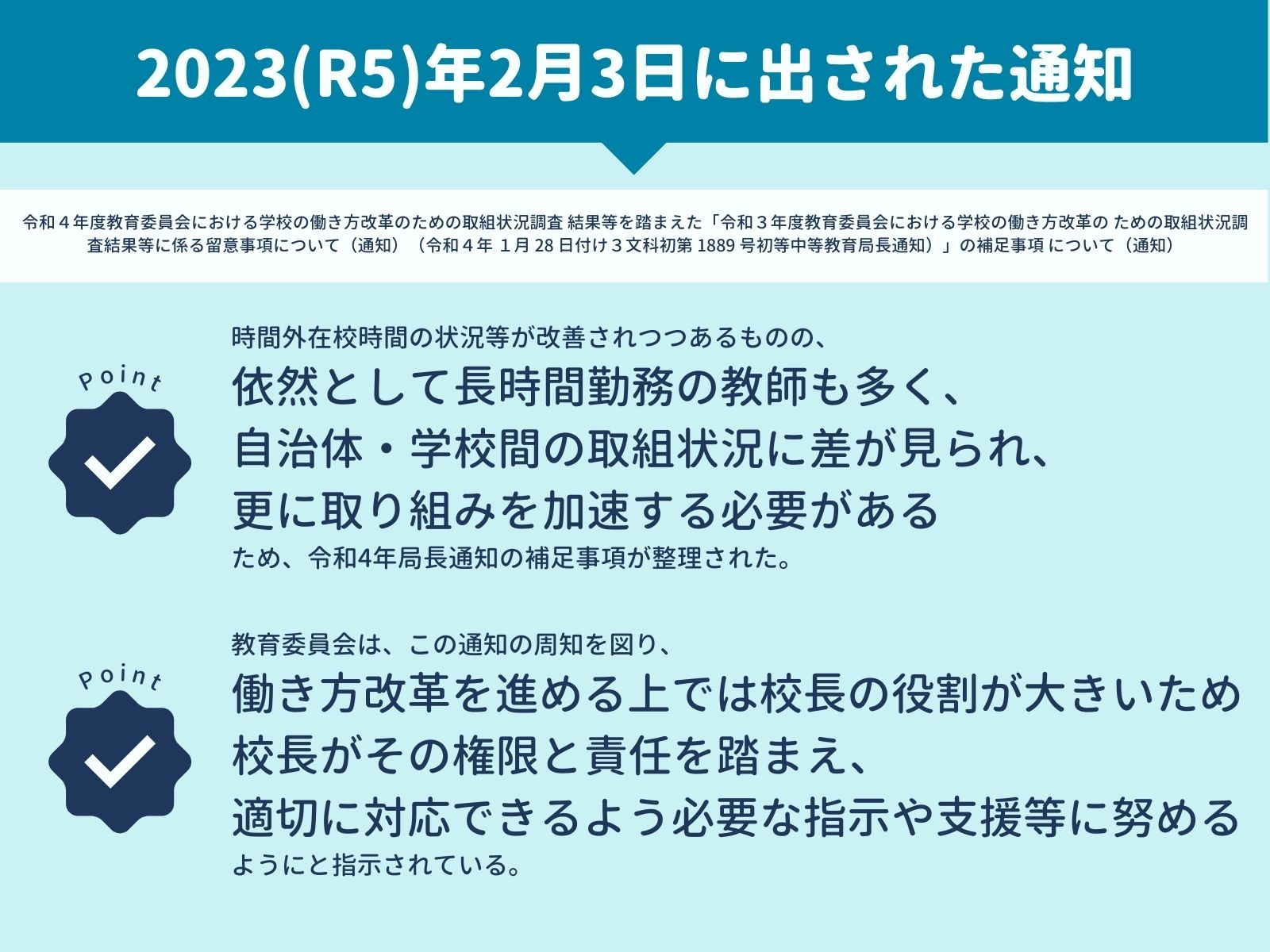 学校の働き方改革のための取組状況調査の結果から、時間外勤務の状況と、変形労働時間制に関する条例の整備状況についてご紹介しました。