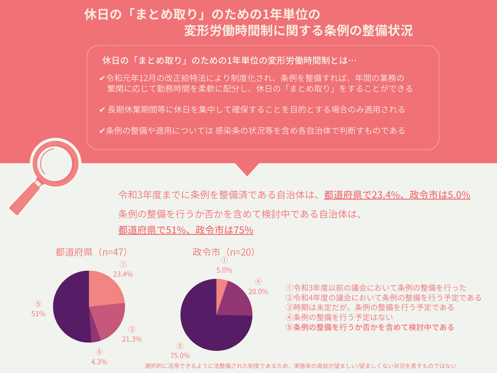 実際、変形労働時間制に関する条例を令和3年までに整備した自治体は都道府県で23.4%、政令市で5%にとどまります。条例の整備を行うか否かを含め検討中であるのが都道府県で51%、政令市で75%を占めました。