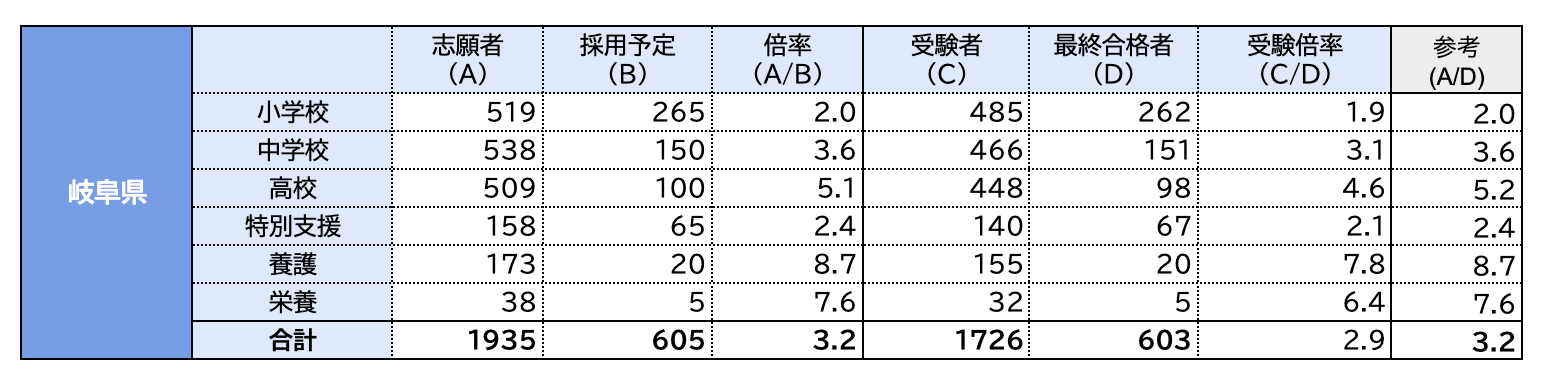 出典:令和5年度採用岐阜県公立学校教員採用選考試験出願状況(令和4年度実施)
