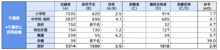 出典:令和5年度(4年度実施)千葉県・千葉市公立学校教員採用候補者選考第2次選考合格発表について