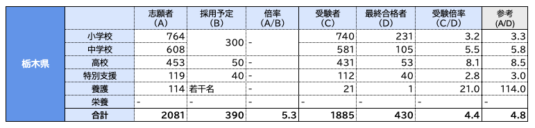 出典:令和5(2023)年度栃木県公立学校新規採用教員選考試験の合格状況