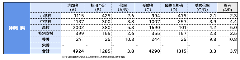 神奈川県の教員採用試験では、小学校で994名、中学校で1007名、高校で1690名が受験し、それぞれ475名、257名、401名が合格しました。