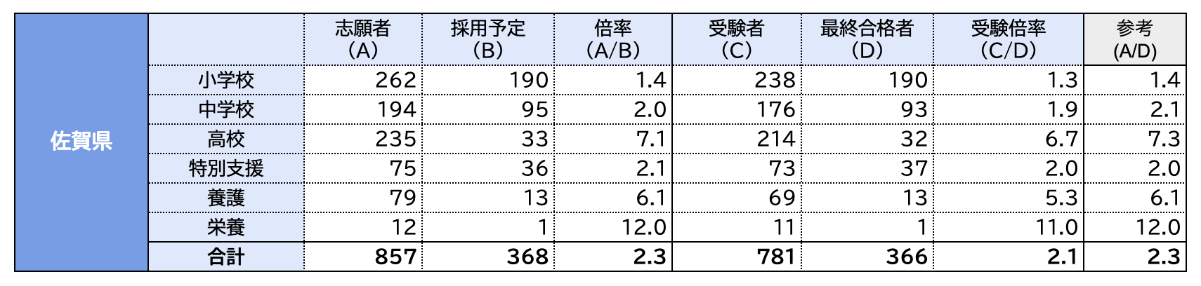 出典:令和5年度佐賀県公立学校教員採用選考試験の結果についてお知らせします