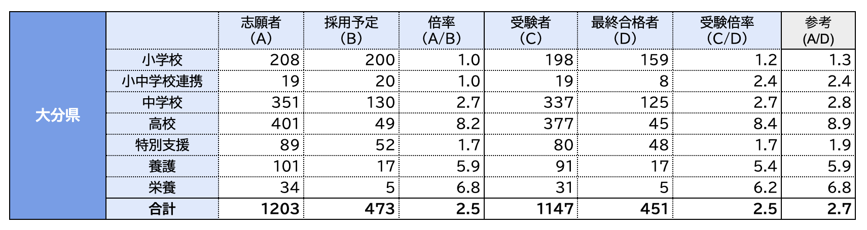 出典:令和5年度 大分県公立学校教員採用選考試験 総合結果