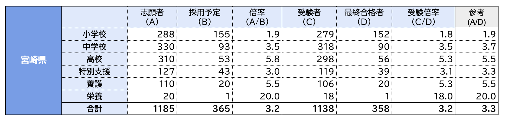 出典:令和5年度採用宮崎県公立学校教員採用第二次選考試験の結果について