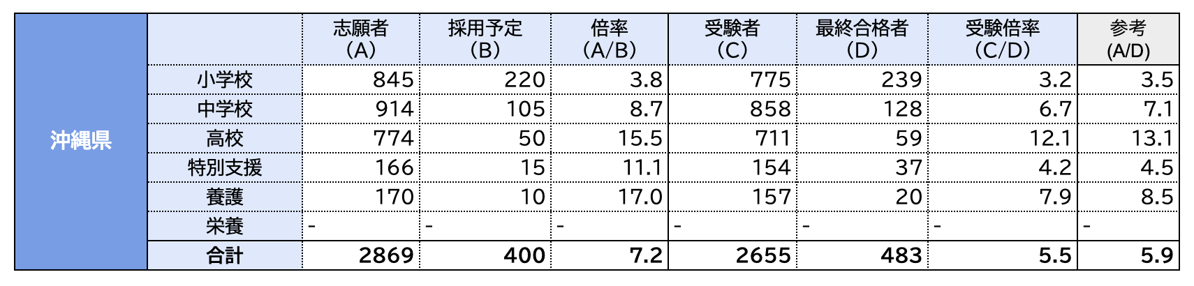 今回は九州・沖縄地方の教員採用試験の結果をご紹介しました。九州ではほぼ全ての採用試験で小学校の区分の倍率が2倍を切っていました。沖縄はどの区分関しても倍率は高めで、採用予定者数に対しても多めの合格者を出していました。