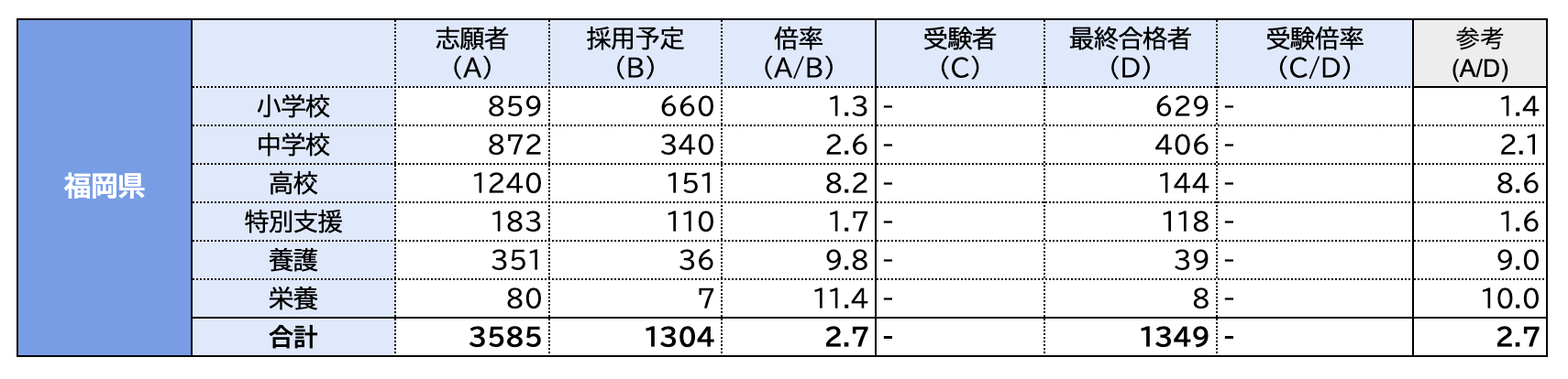 出典:令和5年度 福岡県公立学校教員採用候補者選考試験第二次試験結果について 二次試験状況(福岡県)