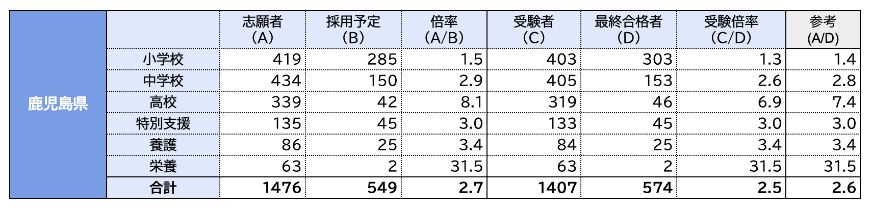 出典:鹿児島県教育委員会・令和5年度鹿児島県公立学校教員等採用選考試験合格者について