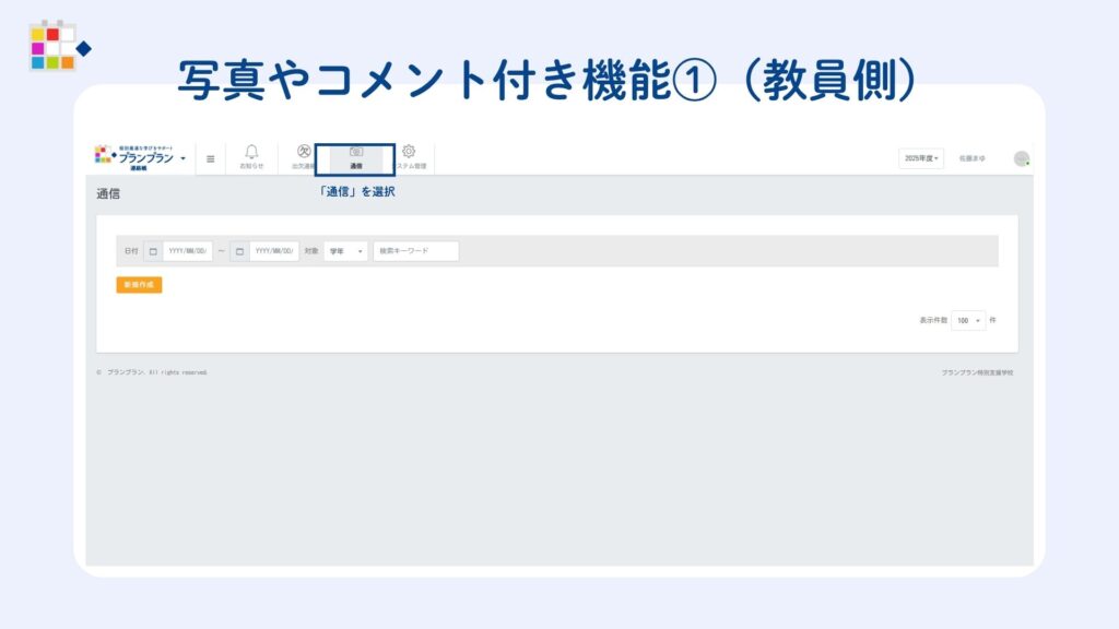 プランプラン連絡帳のなかにある「通信」の機能は、SNSのタイムラインのように、写真やテキストを投稿していくことができる機能です。
